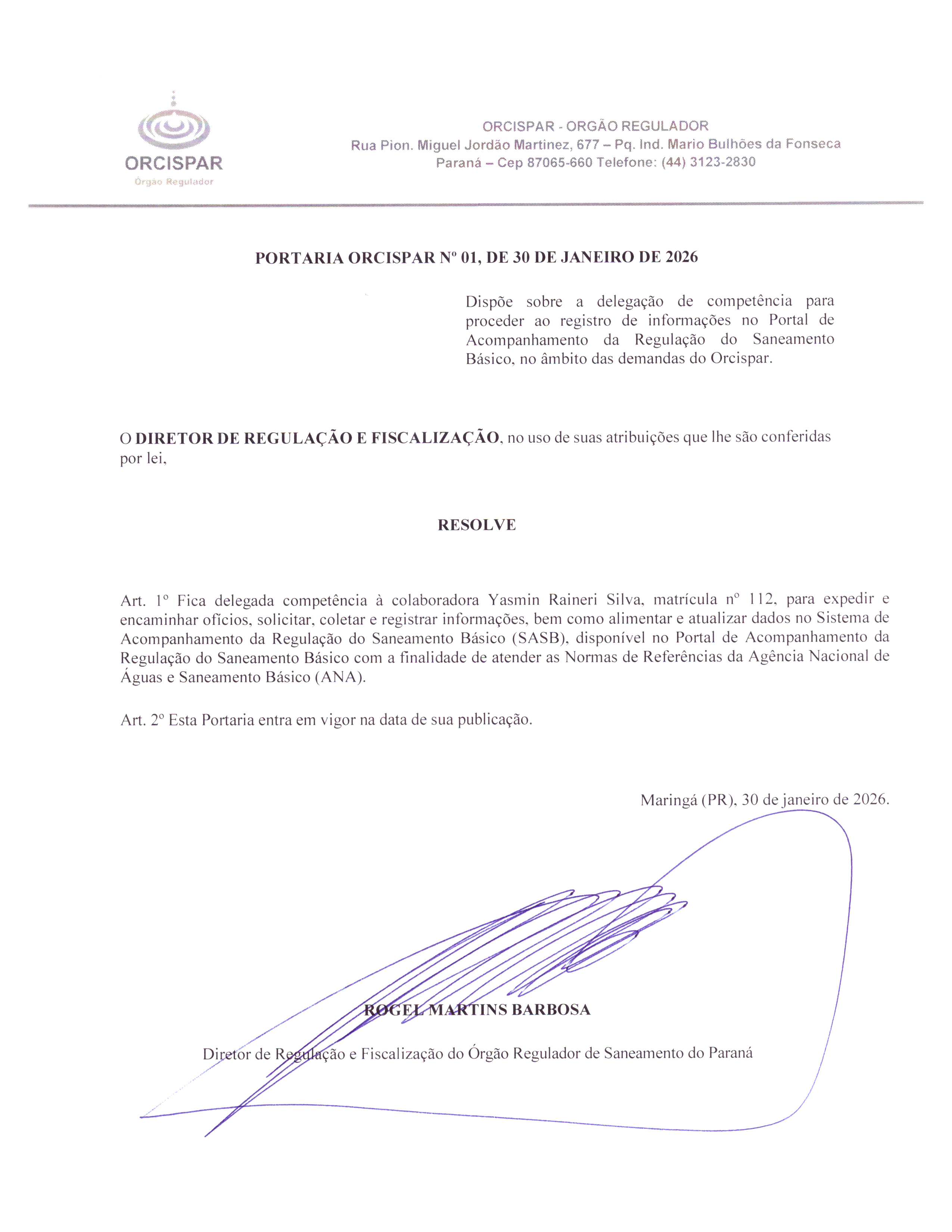 Portaria N°001/2026- Dispõe sobre a delegação de compêtencia para proceder ao registro de informação no portal de acompanhamento da regulação do saneamento básico,nos termos da Resolução ORCISPAR